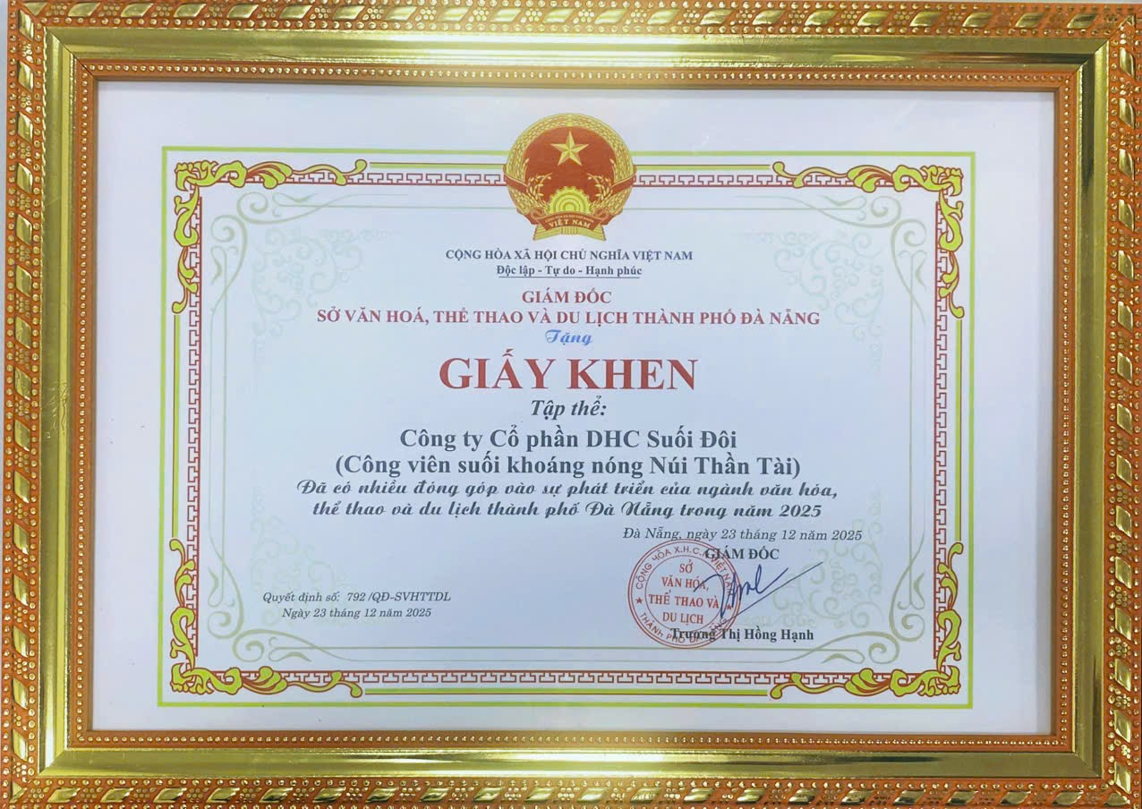 Ngày 25.12 vừa qua, Công ty Cổ phần DHC Suối Đôi, đơn vị thành viên trực thuộc DHC Group và là đơn vị chủ quản Công viên Suối Khoáng Nóng Núi Thần Tài, vinh dự được Sở Văn hóa, Thể thao và Du lịch TP. Đà Nẵng trao tặng Giấy khen nhằm ghi nhận những đóng góp tích cực cho sự phát triển của ngành du lịch địa phương trong năm 2025.